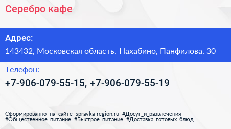 Серебро, кафе по адресу 143432, Московская область, Нахабино, Панфилова, 30 в дальнейшем Организация, размещена в следующих категориях: