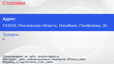 Столовая по адресу 143432, Московская область, Нахабино, Панфилова, 30 в дальнейшем Организация, размещена в следующих категориях: