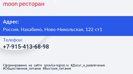 moon, ресторан по адресу Мираторг, 122 с1, Ново-Никольская улица, Опалиха, Красногорск, городской округ Красногорск, Московская область, Центральный федеральный округ, 143405, Россия в дальнейшем Организация, размещена в следующих категориях:
