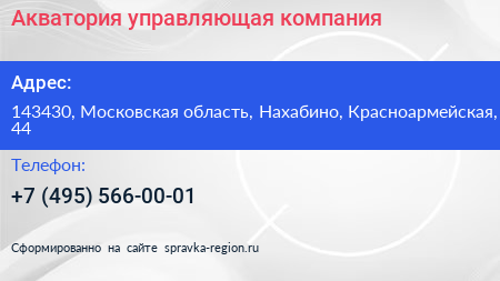 Акватория, управляющая компания по адресу 143430, Московская область, Нахабино, Красноармейская, 44 в дальнейшем Организация, размещена в следующих категориях: