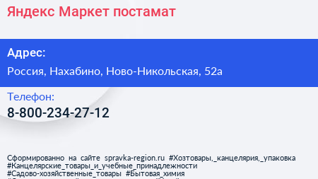 Яндекс.Маркет, постамат по адресу Торговый центр "Никольский", 52Б, Ново-Никольская улица, Опалиха, Красногорск, городской округ Красногорск, Московская область, Центральный федеральный округ, 143443, Россия в дальнейшем Организация, размещена в следующих категориях: