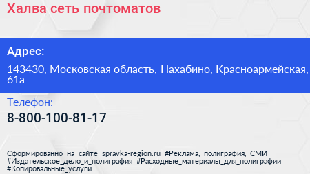 Халва, сеть почтоматов по адресу 143430, Московская область, Нахабино, Красноармейская, 61а в дальнейшем Организация, размещена в следующих категориях: