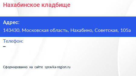Нахабинское кладбище по адресу 143430, Московская область, Нахабино, Советская, 105а в дальнейшем Организация, размещена в следующих категориях: