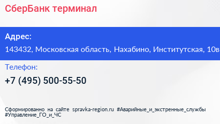 СберБанк, терминал по адресу 143432, Московская область, Нахабино, Институтская, 10в в дальнейшем Организация, размещена в следующих категориях: