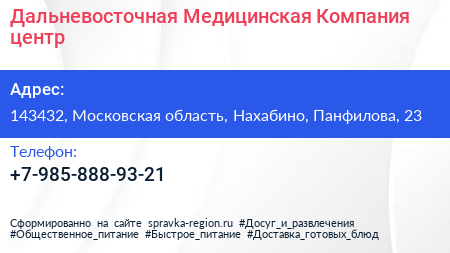 Дальневосточная Медицинская Компания, центр по адресу 143432, Московская область, Нахабино, Панфилова, 23 в дальнейшем Организация, размещена в следующих категориях: