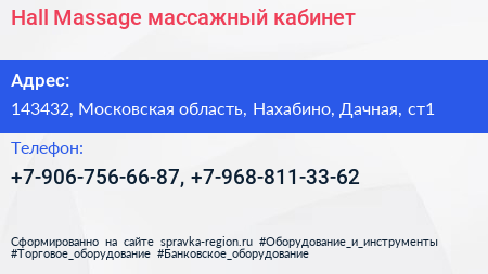 Hall-Massage, массажный кабинет по адресу 143432, Московская область, Нахабино, Дачная, ст1 в дальнейшем Организация, размещена в следующих категориях: