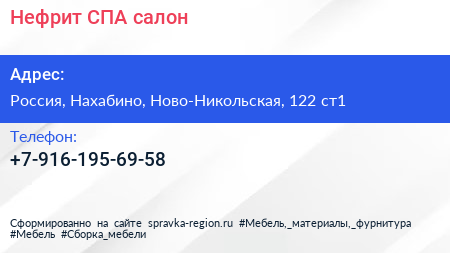 Нефрит, СПА-салон по адресу Мираторг, 122 с1, Ново-Никольская улица, Опалиха, Красногорск, городской округ Красногорск, Московская область, Центральный федеральный округ, 143405, Россия в дальнейшем Организация, размещена в следующих категориях: