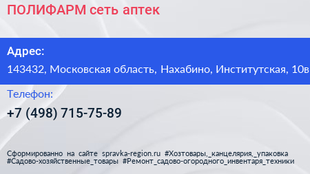 ПОЛИФАРМ, сеть аптек по адресу 143432, Московская область, Нахабино, Институтская, 10в в дальнейшем Организация, размещена в следующих категориях: