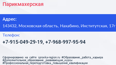 Парикмахерская по адресу 143432, Московская область, Нахабино, Институтская, 17г в дальнейшем Организация, размещена в следующих категориях: