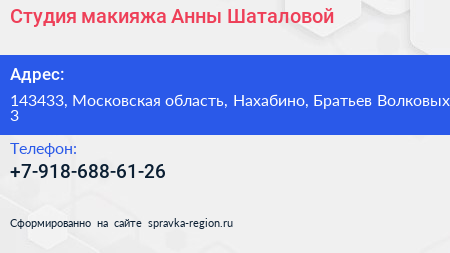 Студия макияжа Анны Шаталовой по адресу 143433, Московская область, Нахабино, Братьев Волковых, 3 в дальнейшем Организация, размещена в следующих категориях: