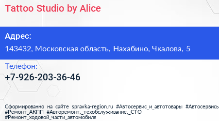 Tattoo Studio by Alice по адресу 143432, Московская область, Нахабино, Чкалова, 5 в дальнейшем Организация, размещена в следующих категориях: