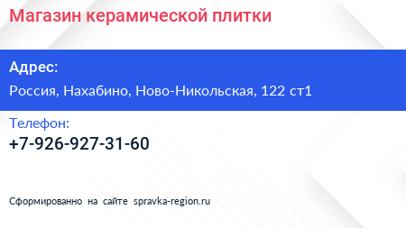 Магазин керамической плитки по адресу Мираторг, 122 с1, Ново-Никольская улица, Опалиха, Красногорск, городской округ Красногорск, Московская область, Центральный федеральный округ, 143405, Россия в дальнейшем Организация, размещена в следующих категориях: