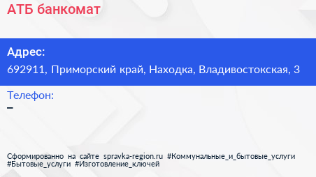 АТБ, банкомат по адресу 692911, Приморский край, Находка, Владивостокская, 3 в дальнейшем Организация, размещена в следующих категориях: