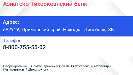 Азиатско-Тихоокеанский банк по адресу 692919, Приморский край, Находка, Линейная, 8Б в дальнейшем Организация, размещена в следующих категориях:
