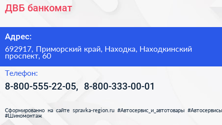 ДВБ, банкомат по адресу 692917, Приморский край, Находка, Находкинский проспект, 60 в дальнейшем Организация, размещена в следующих категориях: