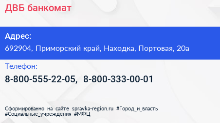 ДВБ, банкомат по адресу 692904, Приморский край, Находка, Портовая, 20а в дальнейшем Организация, размещена в следующих категориях: