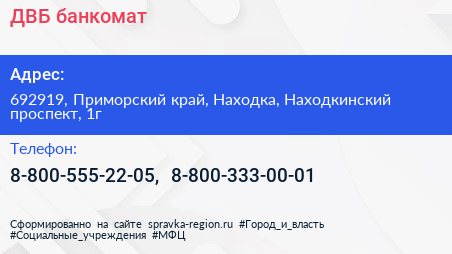 ДВБ, банкомат по адресу 692919, Приморский край, Находка, Находкинский проспект, 1г в дальнейшем Организация, размещена в следующих категориях: