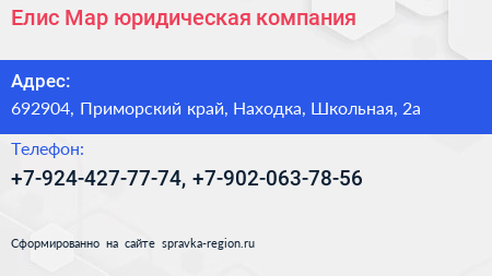 Елис Мар, юридическая компания по адресу 692904, Приморский край, Находка, Школьная, 2а в дальнейшем Организация, размещена в следующих категориях:
