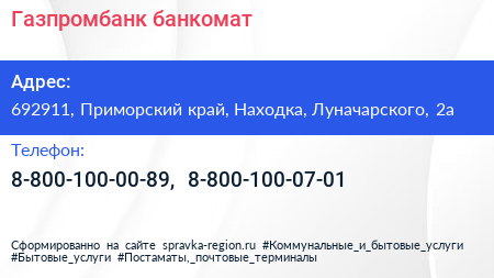 Газпромбанк, банкомат по адресу 692911, Приморский край, Находка, Луначарского, 2а в дальнейшем Организация, размещена в следующих категориях: