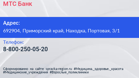 МТС-Банк по адресу 692904, Приморский край, Находка, Портовая, 3/1 в дальнейшем Организация, размещена в следующих категориях:
