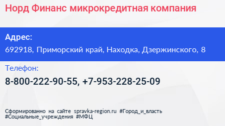 Норд Финанс, микрокредитная компания по адресу 692918, Приморский край, Находка, Дзержинского, 8 в дальнейшем Организация, размещена в следующих категориях: