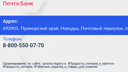 Почта Банк по адресу 692905, Приморский край, Находка, Почтовый переулок, 6 в дальнейшем Организация, размещена в следующих категориях:
