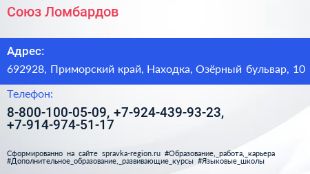 Союз Ломбардов по адресу 692928, Приморский край, Находка, Озёрный бульвар, 10 в дальнейшем Организация, размещена в следующих категориях: