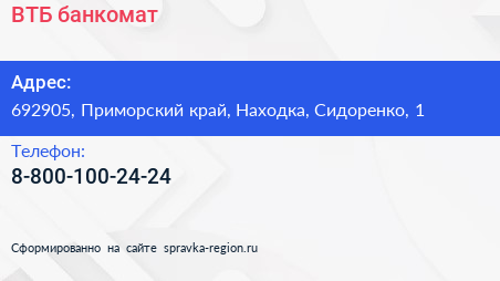 ВТБ, банкомат по адресу 692905, Приморский край, Находка, Сидоренко, 1 в дальнейшем Организация, размещена в следующих категориях: