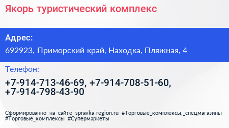 Якорь, туристический комплекс по адресу 692923, Приморский край, Находка, Пляжная, 4 в дальнейшем Организация, размещена в следующих категориях: