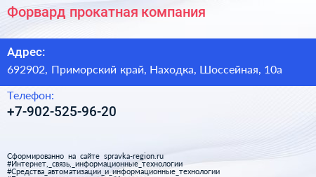 Форвард, прокатная компания по адресу 692902, Приморский край, Находка, Шоссейная, 10а в дальнейшем Организация, размещена в следующих категориях: