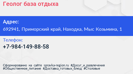 Геолог, база отдыха по адресу 692941, Приморский край, Находка, Мыс Козьмина, 1 в дальнейшем Организация, размещена в следующих категориях:
