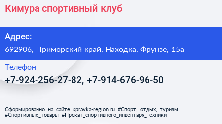 Кимура, спортивный клуб по адресу 692906, Приморский край, Находка, Фрунзе, 15а в дальнейшем Организация, размещена в следующих категориях: