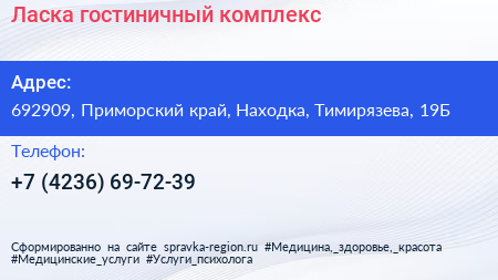 Ласка, гостиничный комплекс по адресу 692909, Приморский край, Находка, Тимирязева, 19Б в дальнейшем Организация, размещена в следующих категориях: