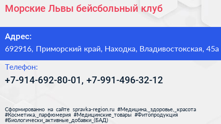 Морские Львы, бейсбольный клуб по адресу 692916, Приморский край, Находка, Владивостокская, 45а в дальнейшем Организация, размещена в следующих категориях: