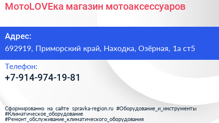 МотоLOVEка, магазин мотоаксессуаров по адресу 692919, Приморский край, Находка, Озёрная, 1а ст5 в дальнейшем Организация, размещена в следующих категориях: