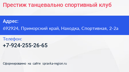 Престиж, танцевально-спортивный клуб по адресу 692924, Приморский край, Находка, Спортивная, 2-2а в дальнейшем Организация, размещена в следующих категориях: