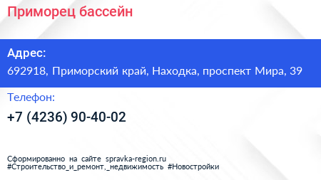 Приморец, бассейн по адресу 692918, Приморский край, Находка, проспект Мира, 39 в дальнейшем Организация, размещена в следующих категориях: