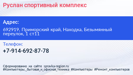 Руслан, спортивный комплекс по адресу 692919, Приморский край, Находка, Безымянный переулок, 1 ст11 в дальнейшем Организация, размещена в следующих категориях:
