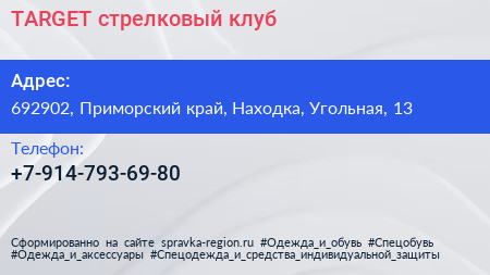 TARGET, стрелковый клуб по адресу 692902, Приморский край, Находка, Угольная, 13 в дальнейшем Организация, размещена в следующих категориях: