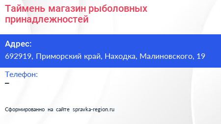 Таймень, магазин рыболовных принадлежностей по адресу 692919, Приморский край, Находка, Малиновского, 19 в дальнейшем Организация, размещена в следующих категориях: