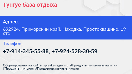 Тунгус, база отдыха по адресу 692924, Приморский край, Находка, Простоквашино, 19 ст1 в дальнейшем Организация, размещена в следующих категориях:
