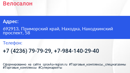 Велосалон по адресу 692913, Приморский край, Находка, Находкинский проспект, 58 в дальнейшем Организация, размещена в следующих категориях: