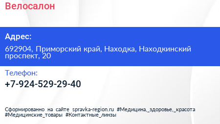 Велосалон по адресу 692904, Приморский край, Находка, Находкинский проспект, 20 в дальнейшем Организация, размещена в следующих категориях:
