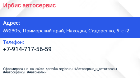 Ирбис, автосервис по адресу 692905, Приморский край, Находка, Сидоренко, 9 ст2 в дальнейшем Организация, размещена в следующих категориях:
