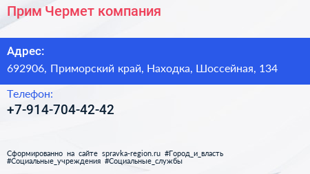 Прим-Чермет, компания по адресу 692906, Приморский край, Находка, Шоссейная, 134 в дальнейшем Организация, размещена в следующих категориях: