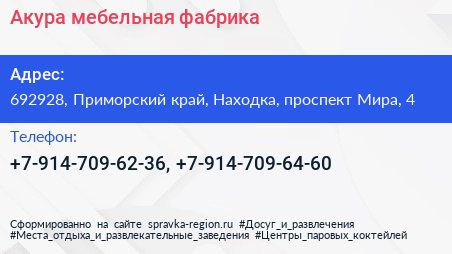 Акура, мебельная фабрика по адресу 692928, Приморский край, Находка, проспект Мира, 4 в дальнейшем Организация, размещена в следующих категориях:
