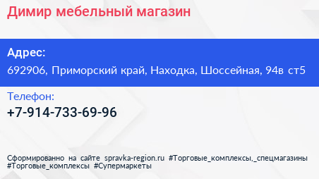 Димир, мебельный магазин по адресу 692906, Приморский край, Находка, Шоссейная, 94в ст5 в дальнейшем Организация, размещена в следующих категориях: