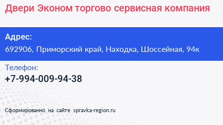 Двери Эконом, торгово-сервисная компания по адресу 692906, Приморский край, Находка, Шоссейная, 94к в дальнейшем Организация, размещена в следующих категориях: