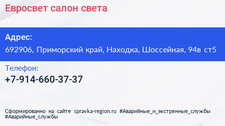 Евросвет, салон света по адресу 692906, Приморский край, Находка, Шоссейная, 94в ст5 в дальнейшем Организация, размещена в следующих категориях: