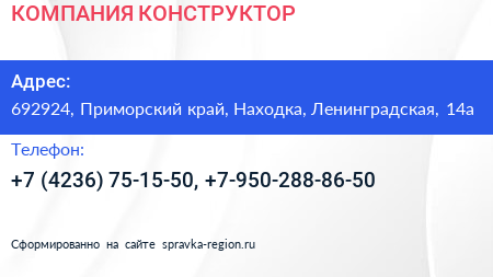 КОМПАНИЯ КОНСТРУКТОР по адресу 692924, Приморский край, Находка, Ленинградская, 14а в дальнейшем Организация, размещена в следующих категориях: